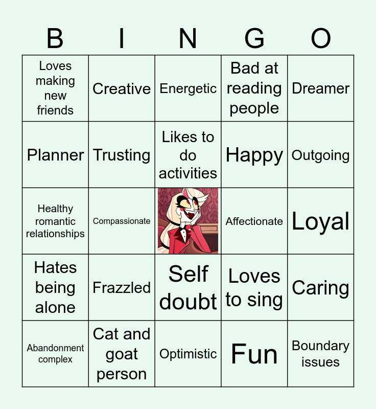 This bingo card has a free space and 24 words: Frazzled, Cat and goat person, Likes to do activities, Abandonment complex, Dreamer, Loves making new friends, Planner, Creative, Affectionate, Self doubt, Happy, Healthy romantic relationships, Loves to sing, Caring, Trusting, Fun, Loyal, Energetic, Outgoing, Compassionate, Boundary issues, Hates being alone, Bad at reading people and Optimistic.