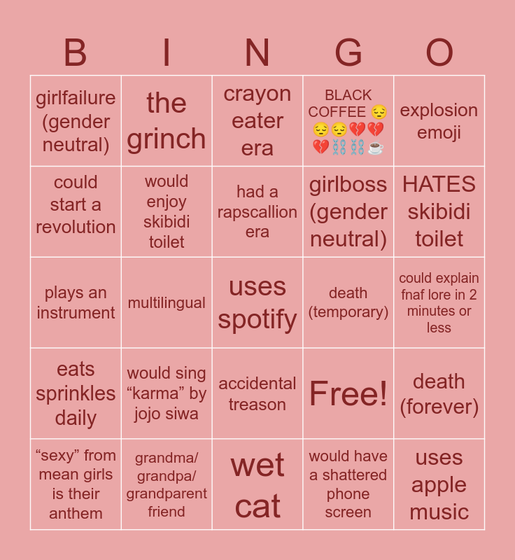 This bingo card has 25 words: would sing “karma” by jojo siwa, wet cat, had a rapscallion era, “sexy” from mean girls is their anthem, explosion emoji, girlfailure (gender neutral), could start a revolution, the grinch, death (temporary), accidental treason, girlboss (gender neutral), plays an instrument, Free!, death (forever), would enjoy skibidi toilet, uses apple music, could explain fnaf lore in 2 minutes or less, crayon eater era, HATES skibidi toilet, multilingual, uses spotify, grandma/ grandpa/ grandparent friend, eats sprinkles daily, BLACK COFFEE 😔😔😔💔💔💔⛓️⛓️☕️ and would have a shattered phone screen.