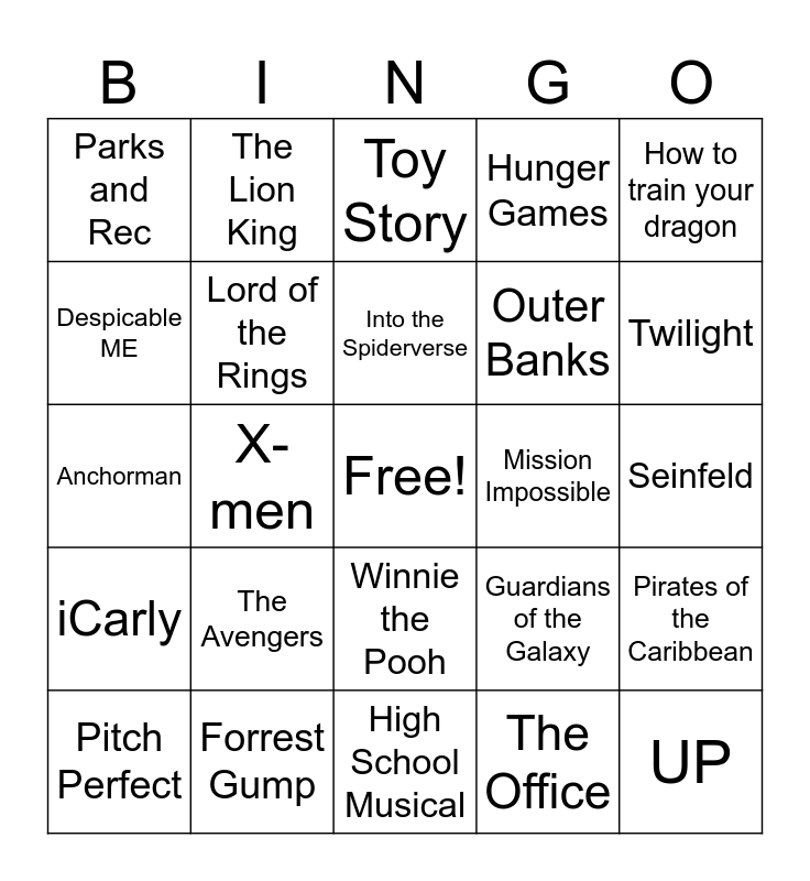 This bingo card has a free space and 48 words: Harry Potter, UP, The Grinch, High School Musical, The Avengers, Star Wars, The Lion King, Top Gun, Despicable ME, Batman, Lord of the Rings, Hunger Games, Pirates of the Caribbean, Guardians of the Galaxy, Monsters Inc., Fast and Furious, Into the Spiderverse, Mission Impossible, Kung Fu Panda, How to train your dragon, X-men, The Office, Parks and Rec, Outer Banks, The Summer I Turned Pretty, Twilight, Pitch Perfect, Wonder Woman, Winnie the Pooh, iCarly, Dune, Cars, Wall-E, Titanic, Forrest Gump, Modern Family, Arrested Development, Seinfeld, How I Met Your Mother, Spongebob, Fairly OddParents, The Incredibles, Toy Story, Back to the Future, Anchorman, The Matrix, Breaking Bad and Big Bang Theory.