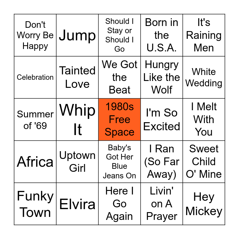 This bingo card has a free space and 54 words: 867-5309, Africa, All Night Long (All Night), Another One Bites the Dust, Baby's Got Her Blue Jeans On, Back in Black, Born in the U.S.A., Call Me, Celebration, Don't Stop Believin", Don't Worry Be Happy, Down Under, Elvira, Funky Town, Heaven is a Place On Earth, Here I Go Again, Hey Mickey, Hungry Like the Wolf, I Love Rock 'N Roll, I Melt With You, I Ran (So Far Away), I Wanna Dance With Somebody, I'm So Excited, It's Raining Men, Jessie's Girl, Jump, Keep Your Hands to Yourself, Kids in America, Kiss, Livin' on A Prayer, Love Shack, Pour Some Sugar on Me, Rock You Like A Hurricane, Sharp Dressed Man, Should I Stay or Should I Go, Smooth Criminal, Summer of '69, Sweet Child O' Mine, Sweet Dreams (Are Made of These), Tainted Love, Take on Me, The Final Countdown, The Safety Dance, Time After Time, Uptown Girl, Video Killed the Radio Star, Wake Me Up Before You Go-Go, Walk Like an Egyptian, We Got the Beat, Whip It, White Wedding, Wild Thing, You Dropped a Bomb on Me and You Got It (The Right Stuff).