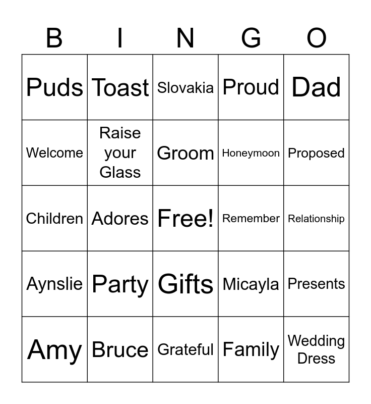 This bingo card has a free space and 75 words: Lucky, Credit, Slovakia, London, Pietermaritzburg, Mr Price, Derivco, Wonderful, Tears, Joy, Mitchell, Bride, Groom, Welcome, Caring, Adores, Love, Wedding Dress, Suits, Dad, Katherine, Children, Raise your Glass, Toast, Proud, Greg, Sandy, Pride, Friendship, Newly Weds, Commitment, Neil, Tori, Micayla, Proposed, Honeymoon, Vows, Future, Relationship, Family, Bingo, Cake, Dance, Marriage, Champagne, Charge your glass, Amy, Puds, Cam, Well wishes, Flowers, Gifts, Celebrate, Photograph, Food, Dinner, Drinks, Happy Couple, Ceremony, Veil, Party, My Wife & I, Nervous, I remember, So happy, Remember, Thank you, Together, Gifts, Presents, Aynslie, Bruce, Cheers, Grateful and Amazing.