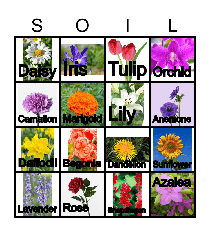 This bingo card has 16 images and 16 words: Rose, Sunflower, Tulip, Daisy, Daffodil, Iris, Dandelion, Snapdragon, Carnation, Marigold, Lavender, Orchid, Begonia, Anemone, Lily and Azalea.