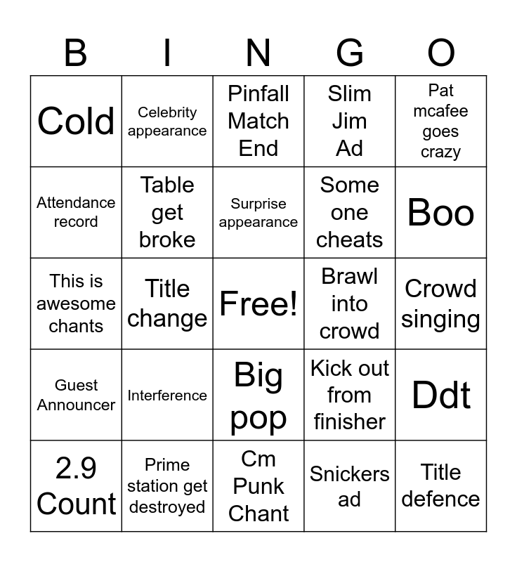 This bingo card has a free space and 29 words: 2.9 Count, Backstage brawl, Title change, Escort to ring, Cold, Pinfall Match End, Table get broke, Interference, Brawl into crowd, Prime station get destroyed, Crowd singing, Title defence, Cm Punk Chant, Snickers ad, Boo, Spear, Big pop, Guest Announcer, Pat mcafee goes crazy, This is awesome chants, Kick out from finisher, Pyro, Some one cheats, Attendance record, Slim Jim Ad, Celebrity appearance, Ddt, Surprise appearance and Chair shot.