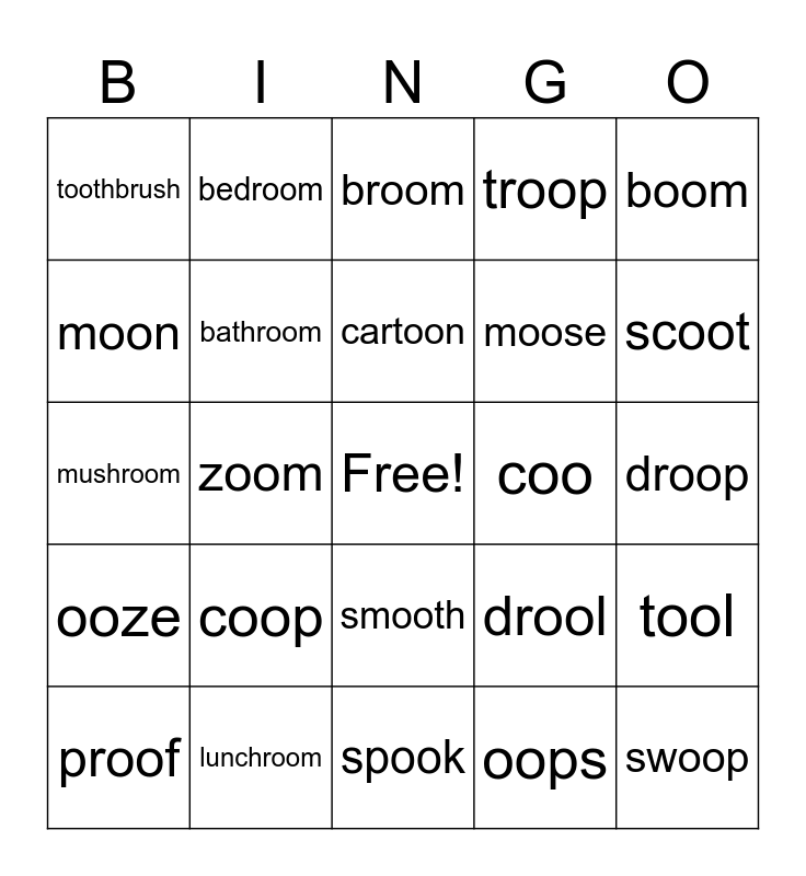 This bingo card has a free space and 34 words: bloom, oops, bamboo, boo, ooze, bathroom, boom, proof, bedroom, boot, cartoon, broom, scoop, classroom, coo, scoot, lunchroom, mushroom, coop, drool, smooth, racoon, toothbrush, droop, spook, swoop, troop, groom, moose, moon, moo, zoom, tool and spoon.
