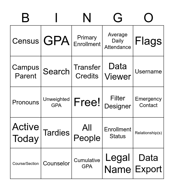 This bingo card has a free space and 54 words: Absences, Active Today, Address, Advanced, All People, Attendance, Average Daily Attendance, Bingo, Campus Parent, Campus Student, Census, Class Rank, Counselor, Course/Section, Courses, Cumulative GPA, Data Export, Data Viewer, Demographics, Emergency Contact, Enrollment Status, Ethnicity, Filter Designer, Flags, Gender, GPA, Grade, Household Phone Number, Language, Legal Name, Non Household Member, Password, Primary Address, Primary Email, Primary Enrollment, Primary Household, Pronouns, Relationship(s), Schedule, Search, Secondary Household, Special Education Status, Student ID Number, Student Name, Tardies, Teacher Name, Tool, Transcript, Transfer Credits, Unweighted GPA, Username, Weighted GPA, Withdrawal Date and Start Date.
