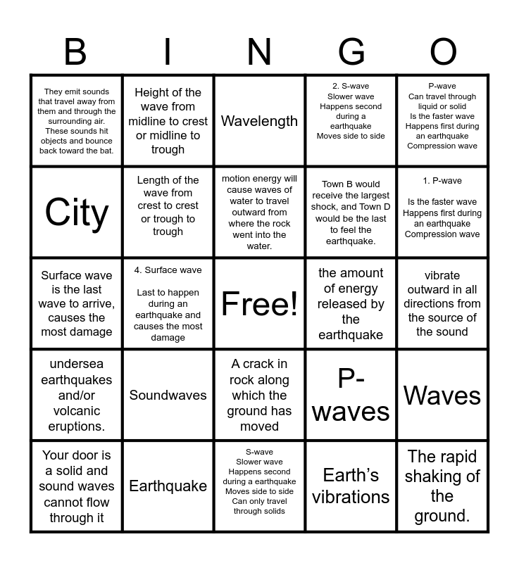 This bingo card has a free space and 24 words: Soundwaves, Earthquake, motion energy will cause waves of water to travel outward from where the rock went into the water., Your door is a solid and sound waves cannot flow through it, P-wave Can travel through liquid or solid Is the faster wave Happens first during an earthquake Compression wave, They emit sounds that travel away from them and through the surrounding air. These sounds hit objects and bounce back toward the bat., City, Height of the wave from midline to crest or midline to trough, the amount of energy released by the earthquake, A crack in rock along which the ground has moved, Town B would receive the largest shock, and Town D would be the last to feel the earthquake., Surface wave is the last wave to arrive, causes the most damage, P-waves, Waves, Length of the wave from crest to crest or trough to trough, Earth’s vibrations, vibrate outward in all directions from the source of the sound, Wavelength, 1. P-wave Is the faster wave Happens first during an earthquake Compression wave, 4. Surface wave Last to happen during an earthquake and causes the most damage, The rapid shaking of the ground., undersea earthquakes and/or volcanic eruptions., 2. S-wave Slower wave Happens second during a earthquake Moves side to side and S-wave Slower wave Happens second during a earthquake Moves side to side Can only travel through solids.