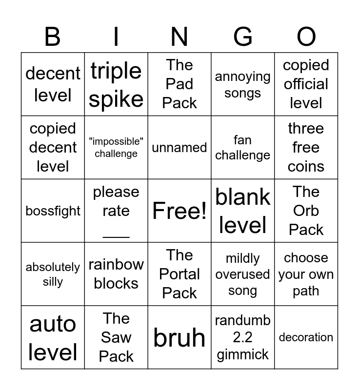 This bingo card has a free space and 24 words: rainbow blocks, The Saw Pack, unnamed, auto level, copied official level, decent level, copied decent level, triple spike, blank level, The Portal Pack, fan challenge, bossfight, mildly overused song, choose your own path, "impossible" challenge, randumb 2.2 gimmick, The Orb Pack, The Pad Pack, three free coins, please rate ___, decoration, absolutely silly, annoying songs and bruh.