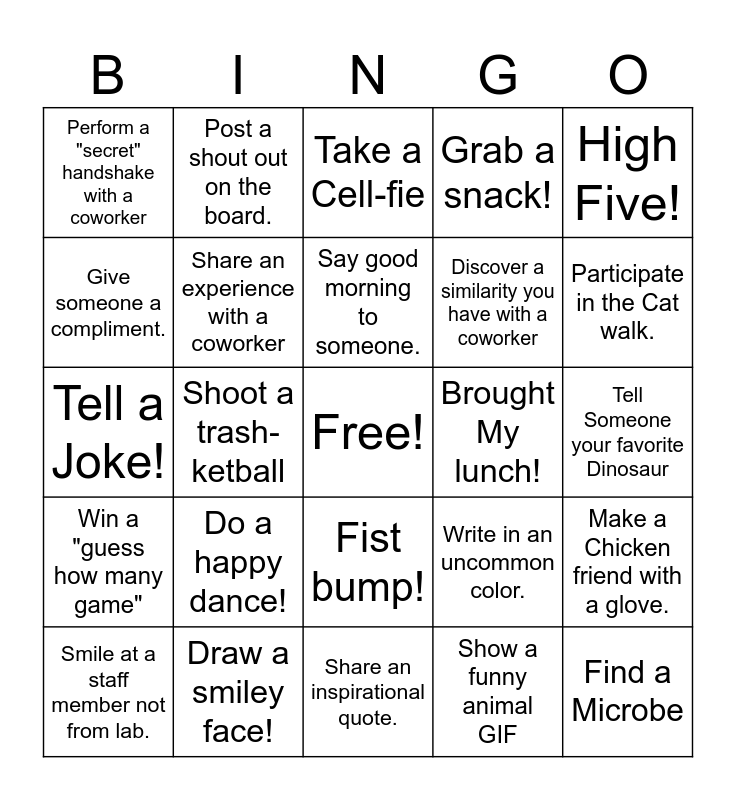 This bingo card has a free space and 24 words: Do a happy dance!, Draw a smiley face!, Say good morning to someone., Smile at a staff member not from lab., High Five!, Perform a "secret" handshake with a coworker, Give someone a compliment., Post a shout out on the board., Brought My lunch!, Fist bump!, Discover a similarity you have with a coworker, Tell a Joke!, Write in an uncommon color., Make a Chicken friend with a glove., Share an experience with a coworker, Show a funny animal GIF, Tell Someone your favorite Dinosaur, Take a Cell-fie, Participate in the Cat walk., Shoot a trash-ketball, Find a Microbe, Win a "guess how many game", Grab a snack! and Share an inspirational quote..