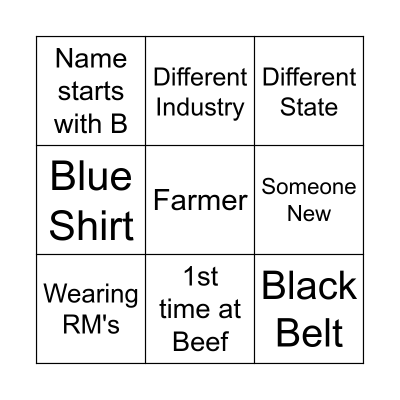 This bingo card has a free space and 8 words: Someone New, Different State, Different Industry, Wearing RM's, Name starts with B, Black Belt, Blue Shirt and 1st time at Beef.