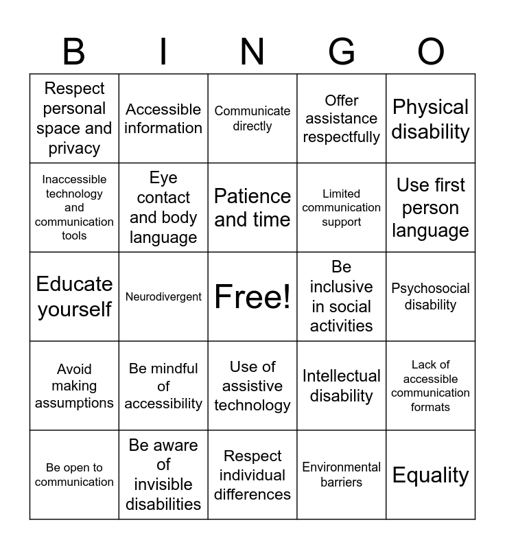 This bingo card has a free space and 28 words: Lack of accessible communication formats, Attitudinal barriers, Limited communication support, Environmental barriers, Inaccessible technology and communication tools, Communicate directly, Accessible information, Avoid making assumptions, Be inclusive in social activities, Be open to communication, Educate yourself, Offer assistance respectfully, Be aware of invisible disabilities, Respect individual differences, Use first person language, Ask before offering assistance, Be mindful of accessibility, Eye contact and body language, Patience and time, Use of assistive technology, Respect personal space and privacy, Equity, Equality, Neurodivergent, Psychosocial disability, Intellectual disability, Physical disability and Dual disability.