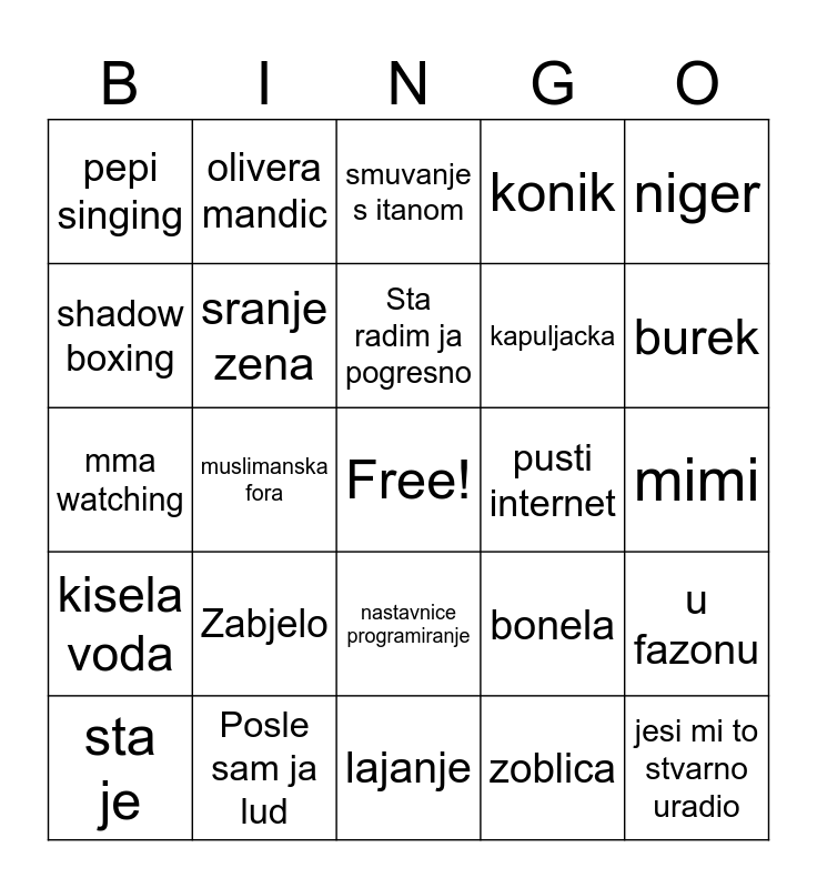 This bingo card has a free space and 24 words: Zabjelo, Posle sam ja lud, Sta radim ja pogresno, sta je, niger, pepi singing, shadow boxing, olivera mandic, pusti internet, nastavnice programiranje, kapuljacka, mma watching, bonela, u fazonu, sranje zena, zoblica, mimi, smuvanje s itanom, burek, muslimanska fora, jesi mi to stvarno uradio, kisela voda, konik and lajanje.