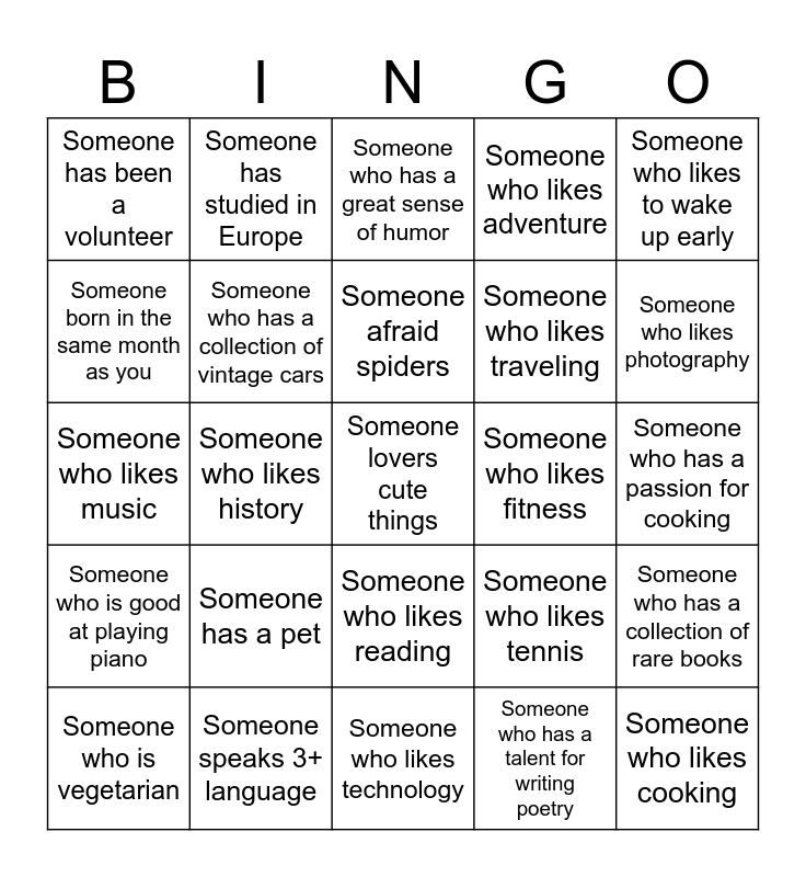 This bingo card has a free space and 24 words: Someone has a pet, Someone speaks 3+ language, Someone afraid spiders, Someone who is vegetarian, Someone who likes to wake up early, Someone has been a volunteer, Someone born in the same month as you, Someone has studied in Europe, Someone who likes fitness, Someone who likes reading, Someone who likes traveling, Someone who likes music, Someone who likes tennis, Someone who has a collection of rare books, Someone who has a collection of vintage cars, Someone who has a talent for writing poetry, Someone who has a passion for cooking, Someone who has a great sense of humor, Someone who likes photography, Someone who likes history, Someone who likes cooking, Someone who is good at playing piano, Someone who likes adventure and Someone who likes technology.