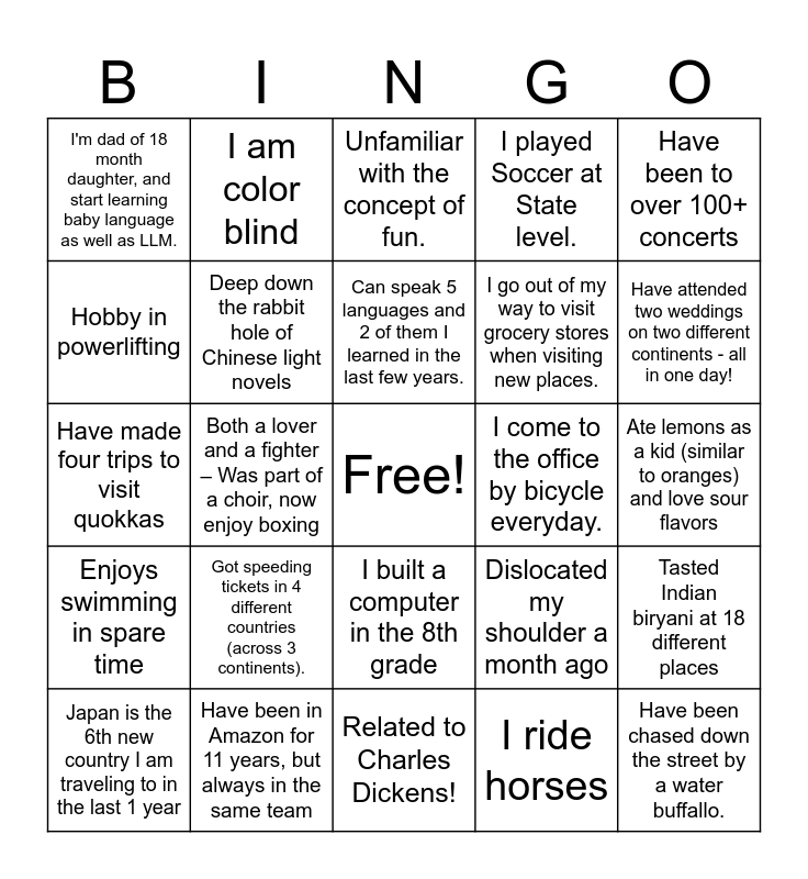 This bingo card has a free space and 38 words: Have done skydiving twice, Have done high altitude himalayan treks multiple times, Indian but have lived in the UAE and in Japan more than I lived in India., Deep down the rabbit hole of Chinese light novels, Tasted Indian biryani at 18 different places, Got speeding tickets in 4 different countries (across 3 continents)., Can speak 5 languages and 2 of them I learned in the last few years., Was offered a lead role to star in a movie, Have been to over 100+ concerts, I go out of my way to visit grocery stores when visiting new places., Both a lover and a fighter – Was part of a choir, now enjoy boxing, I played Soccer at State level., Have been chased down the street by a water buffallo., Ate lemons as a kid (similar to oranges) and love sour flavors, Hobby in powerlifting, Enjoys swimming in spare time, Usually imagine using an abacus when doing maths., Unfamiliar with the concept of fun., Originally from Alaska!, I come to the office by bicycle everyday., I'm dad of 18 month daughter, and start learning baby language as well as LLM., Have been in Amazon for 11 years, but always in the same team, Have attended two weddings on two different continents - all in one day!, Japan is the 6th new country I am traveling to in the last 1 year, Triathlon beginner, Related to Charles Dickens!, Recently visited Shanghai, China with my 7-year-old daughter to celebrate my grandmother's 100-year old birthday., My Alexa can now feed the fish or change the water., I was born in Europe, grew up in Japan, studied in US, got a job in Singapore, found another job in US, and finally settled in Japan., I moved 9 times in 7 years in Seattle, Used to play waterpolo, I built a computer in the 8th grade, I ride horses, I am color blind, This is my first sticker in my passport!, Dislocated my shoulder a month ago, Have made four trips to visit quokkas and I am half Japanese / half German.