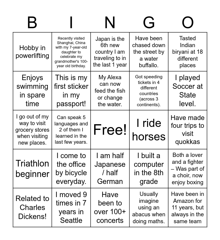 This bingo card has a free space and 34 words: Was offered a lead role to star in a movie, Usually imagine using an abacus when doing maths., Used to play waterpolo, Unfamiliar with the concept of fun., Triathlon beginner, This is my first sticker in my passport!, Tasted Indian biryani at 18 different places, Related to Charles Dickens!, Recently visited Shanghai, China with my 7-year-old daughter to celebrate my grandmother's 100-year old birthday., Originally from Alaska!, My Alexa can now feed the fish or change the water., Japan is the 6th new country I am traveling to in the last 1 year, I'm dad of 18 month daughter, and start learning baby language as well as LLM., I was born in Europe, grew up in Japan, studied in US, got a job in Singapore, found another job in US, and finally settled in Japan., I ride horses, I played Soccer at State level., I moved 9 times in 7 years in Seattle, I go out of my way to visit grocery stores when visiting new places., I come to the office by bicycle everyday., I built a computer in the 8th grade, I am half Japanese / half German, I am color blind, Hobby in powerlifting, Have made four trips to visit quokkas, Have been to over 100+ concerts, Have been in Amazon for 11 years, but always in the same team, Have been chased down the street by a water buffallo., Have attended two weddings on two different continents - all in one day!, Got speeding tickets in 4 different countries (across 3 continents)., Enjoys swimming in spare time, Dislocated my shoulder a month ago, Can speak 5 languages and 2 of them I learned in the last few years., Both a lover and a fighter – Was part of a choir, now enjoy boxing and Ate lemons as a kid (similar to oranges) and love sour flavors.