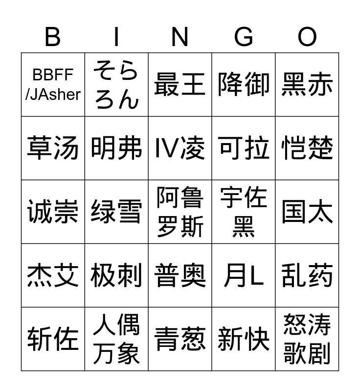 This bingo card has a free space and 24 words: 极刺, 人偶万象, IV凌, 斩佐, 黑赤, BBFF /JAsher, 草汤, そらろん, 宇佐黑, 普奥, 可拉, 诚崇, 月L, 乱药, 明弗, 新快, 国太, 最王, 恺楚, 绿雪, 怒涛歌剧, 杰艾, 降御 and 青葱.