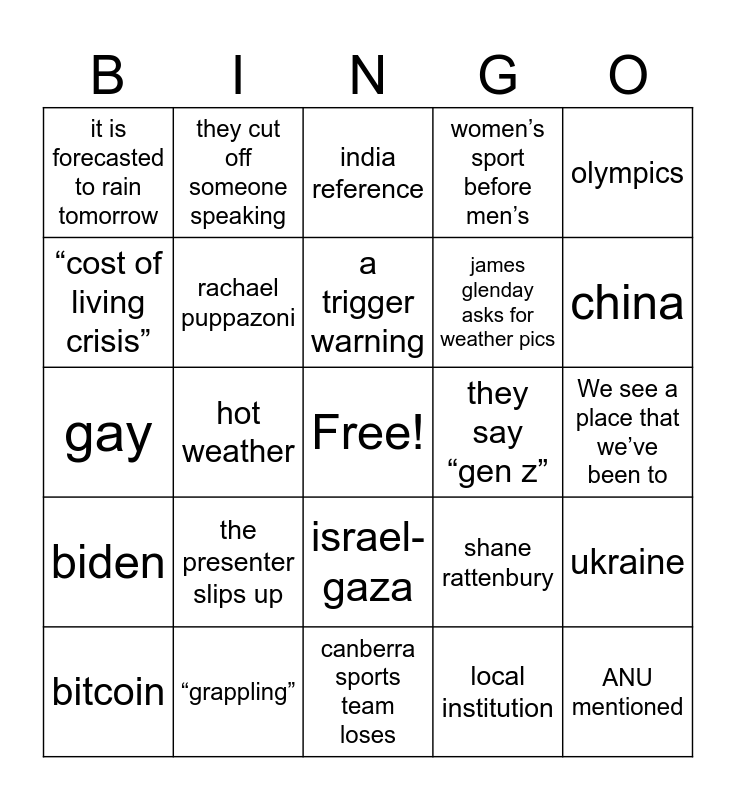 This bingo card has a free space and 38 words: albo makes an appearance, not james glenday, disability + sport, rachael puppazoni, ukraine, the presenter slips up, a trigger warning, expressive statement during the weather, olympics, james glenday asks for weather pics, hot weather, women’s sport before men’s, ANU mentioned, We see a place that we’ve been to, “cost of living crisis”, biden, trump, india reference, the royals mentioned, they say “gen z”, it is forecasted to rain tomorrow, “grappling”, china, bitcoin, looks at desk after the news, canberra sports team loses, “dozens”, issues regarding the elderly, police do bad thing, james glenday says n degrees maybe even n+1, david pocock/ bald white guy that looks similar, israel-gaza, local institution, they cut off someone speaking, “back home”, shane rattenbury, gay and bruce lehrmann.