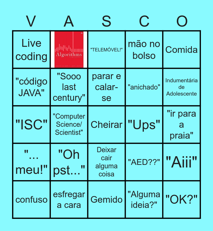 This bingo card has 1 images, a free space and 30 words: Gemido, Bufar, "Computer Science/ Scientist", Parar e olhar para cima/baixo, Live coding, "TELEMÓVEL!", "Sooo last century", "AED??", "Ups", "Alguma ideia?", "ir para a praia", "OK?", "Luzinha", "Guys", Indumentária de Adolescente, Tirar e Meter os Óculos, "Aiii", "Oh pst...", "... meu!", Deixar cair alguma coisa, Comida, for each, confuso, "anichado", "código JAVA", mão no bolso, "ISC", esfregar a cara, parar e calar-se and "Professora Diana".