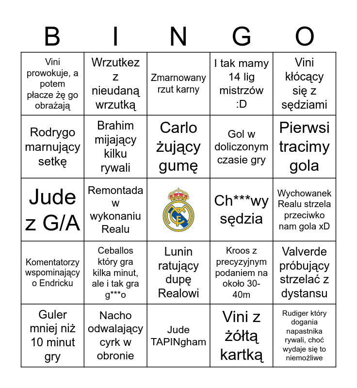 This bingo card has a free space and 24 words: Ceballos który gra kilka minut, ale i tak gra g***o, Nacho odwalający cyrk w obronie, Carlo żujący gumę, Guler mniej niż 10 minut gry, Vini kłócący się z sędziami, Vini prowokuje, a potem płacze żę go obrażają, Rodrygo marnujący setkę, Wrzutkez z nieudaną wrzutką, Ch***wy sędzia, Lunin ratujący dupę Realowi, Gol w doliczonym czasie gry, Jude z G/A, Kroos z precyzyjnym podaniem na około 30-40m, Valverde próbujący strzelać z dystansu, Brahim mijający kilku rywali, Vini z żółtą kartką, Wychowanek Realu strzela przeciwko nam gola xD, Zmarnowany rzut karny, Pierwsi tracimy gola, Remontada w wykonaniu Realu, Rudiger który dogania napastnika rywali, choć wydaje się to niemożliwe, Komentatorzy wspominający o Endricku, I tak mamy 14 lig mistrzów :D and Jude TAPINgham.