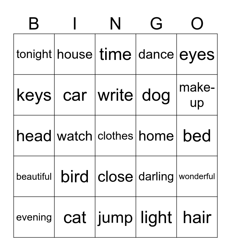 This bingo card has a free space and 24 words: evening, bird, write, light, eyes, tonight, house, time, home, bed, head, car, darling, wonderful, keys, cat, jump, dance, make-up, beautiful, watch, close, dog and hair.