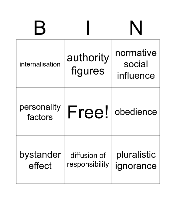 This bingo card has a free space and 21 words: confederates, situational factors, authority figures, informational social influence, competence, bystander effect, internalisation, normative social influence, compliance, diffusion of responsibility, similarity, personality factors, noticing the event, deindiviuation, obedience, identification, conformity, mood, pluralistic ignorance, piliavin and Asch.