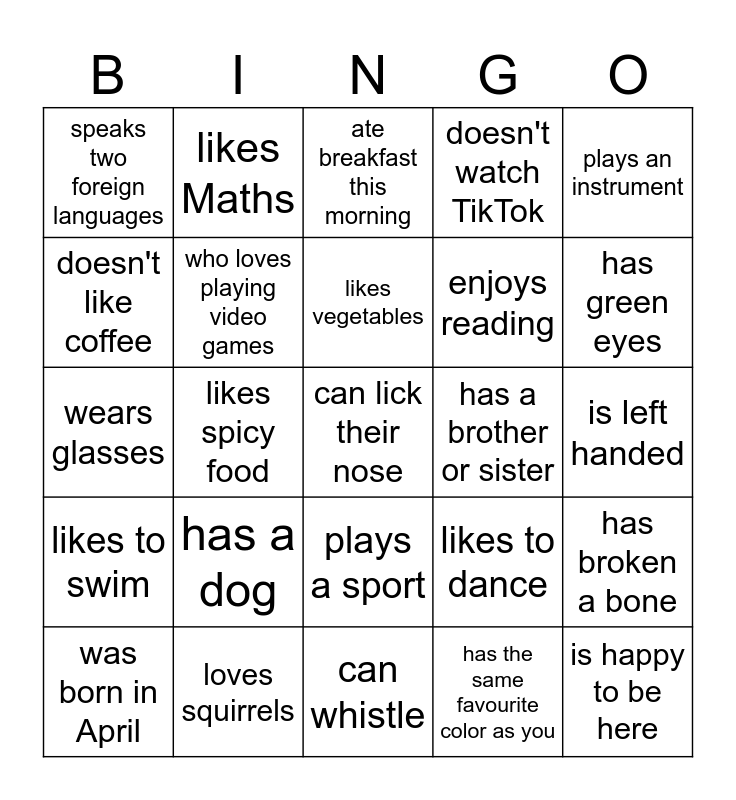 This bingo card has a free space and 24 words: has a dog, loves squirrels, likes vegetables, was born in April, plays an instrument, speaks two foreign languages, doesn't like coffee, likes Maths, has a brother or sister, plays a sport, enjoys reading, wears glasses, likes to dance, has broken a bone, who loves playing video games, has the same favourite color as you, is left handed, ate breakfast this morning, has green eyes, likes spicy food, is happy to be here, likes to swim, doesn't watch TikTok and can whistle.