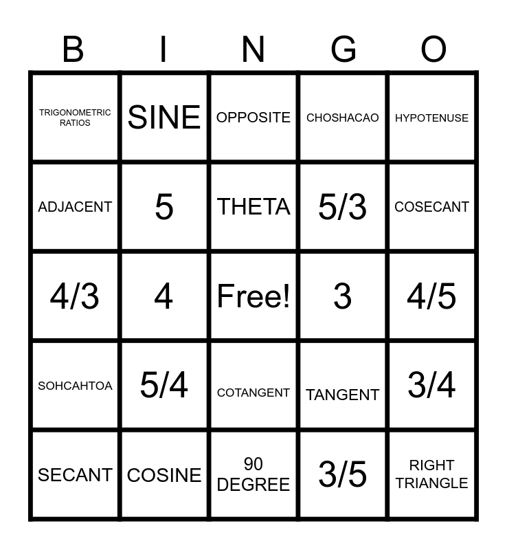 This bingo card has a free space and 24 words: 5/4, COSINE, THETA, SECANT, HYPOTENUSE, TRIGONOMETRIC RATIOS, ADJACENT, SINE, 3, COTANGENT, 5/3, 4/3, TANGENT, 3/4, 5, 3/5, 4/5, OPPOSITE, COSECANT, 4, RIGHT TRIANGLE, SOHCAHTOA, CHOSHACAO and 90 DEGREE.