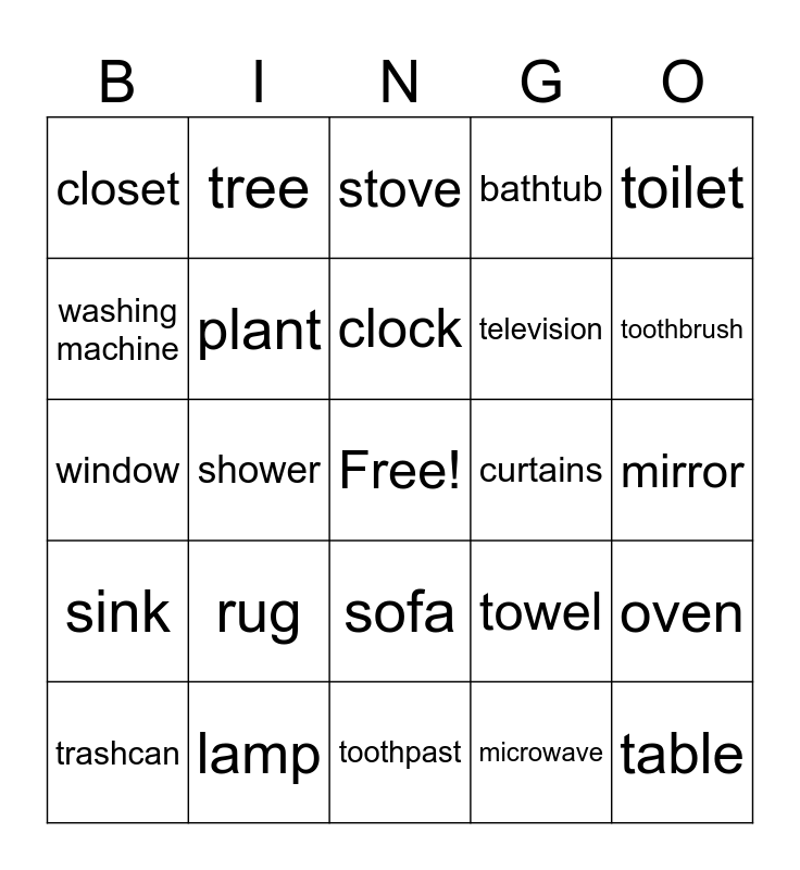 This bingo card has a free space and 40 words: chair, window, bed, plant, lamp, sofa, clock, iron, toilet, sink, shower, bathtub, table, mirror, curtains, rug, cupboard, closet, fridge, stove, oven, microwave, television, washing machine, plate, spoon, fork, knife, pot, pan, glass, trashcan, soap, towel, toothbrush, toothpast, toilet paper, grass, tree and flowers.