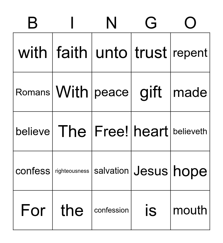 This bingo card has a free space and 29 words: For, and, The, man, with, unto, With, righteousness, heart, the, believeth, mouth, confession, is, made, unto, salvation, confess, repent, believe, Jesus, redeems, gift, Romans, trust, faith, hope, peace and love.