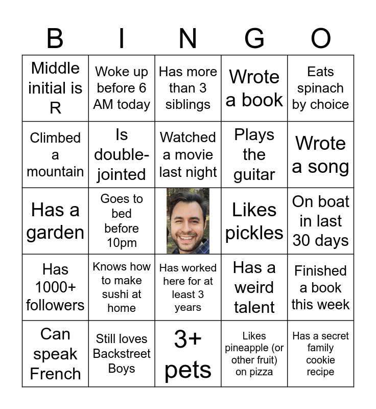 This bingo card has a free space and 27 words: Has a weird talent, Birth month is April, Plays the guitar, 3+ pets, Climbed a mountain, Has more than 3 siblings, Woke up before 6 AM today, Has 1000+ followers, Likes pickles, Finished a book this week, Has a garden, Wrote a book, Can speak French, Still loves Backstreet Boys, Wrote a song, Prefers summer over winter, Is double-jointed, Watched a movie last night, Knows how to make sushi at home, Middle initial is R, On boat in last 30 days, Likes pineapple (or other fruit) on pizza, Goes to bed before 10pm, Has a secret family cookie recipe, Has worked here for at least 3 years, Eats spinach by choice and Is a twin or triplet.