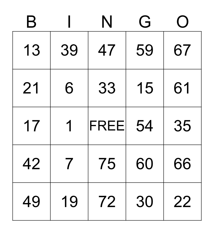 This bingo card has a free space and 24 words: 7, 19, 33, 49, 67, 13, 21, 39, 54, 75, 15, 17, 60, 66, 6, 30, 35, 47, 61, 1, 22, 42, 59 and 72.