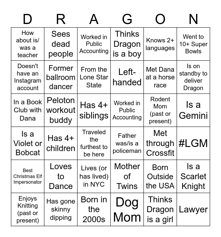This bingo card has 55 words: Free!, Traveled the furthest to be here, Authored a book, How about is/ was a teacher, Met through Crossfit, Dana's coworker (past or present), Doesn't have an Instagram account, Birthday gal today, From the Lone Star State, Born in the Year of the Dragon, Thinks Dragon is a boy, Thinks Dragon is a girl, Mother of Twins, Lives (or has lived) in NYC, Mother of a “Star”, Born Outside the USA, Knows 2+ languages, Is on standby to deliver Dragon, Met Dana on a blind date, In a Book Club with Dana, Peloton workout buddy, Is a Scarlet Knight, Is a Violet or Bobcat, Worked in Public Accounting, #1 Swiftie, Former ballroom dancer, #LGM, Lives (or has lived) in Dana’s hometown, Has 4+ siblings, Has 4+ children, Bunny Mom, Dog Mom, One of the "Harries", Dana's primary caretaker as an infant, Went to 10+ Super Bowls, Met Dana at a horse race, Lawyer, Worked in Public Accounting, Best Christmas Elf Impersonator, Enjoys Knitting (past or present), Sees dead people, Went to an Osmond Concert, Beauty pageant participant, Sunshine State resident (past or present), Rodent Mom (past or present), Father was/is a policeman, Named after a grand/great-grandparent, Born in the 2000s, Loves to Dance, Left-handed, Has gone skinny dipping, Has gotten grounded, Has been to a fortune teller, Is a Gemini and Has a squatty potty.