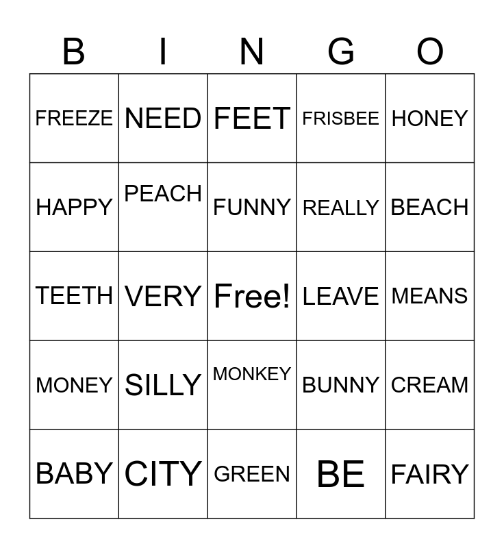 This bingo card has a free space and 26 words: MONKEY, BE, FUNNY, CITY, HONEY, FREEZE, HAPPY, NEED, MEANS, BUNNY, REALLY, TEETH, CREAM, BABY, VERY, FAMILY, FRISBEE, MONEY, FEET, FAIRY, BEACH, GREEN, LEAVE, SILLY, PEACH and HAIRY.