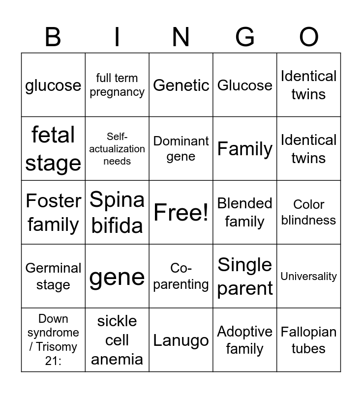 This bingo card has a free space and 24 words: gene, sickle cell anemia, Dominant gene, Down syndrome / Trisomy 21:, Identical twins, glucose, fetal stage, full term pregnancy, Blended family, Co-parenting, Family, Foster family, Single parent, Universality, Self-actualization needs, Adoptive family, Color blindness, Genetic, Identical twins, Spina bifida, Fallopian tubes, Germinal stage, Glucose and Lanugo.