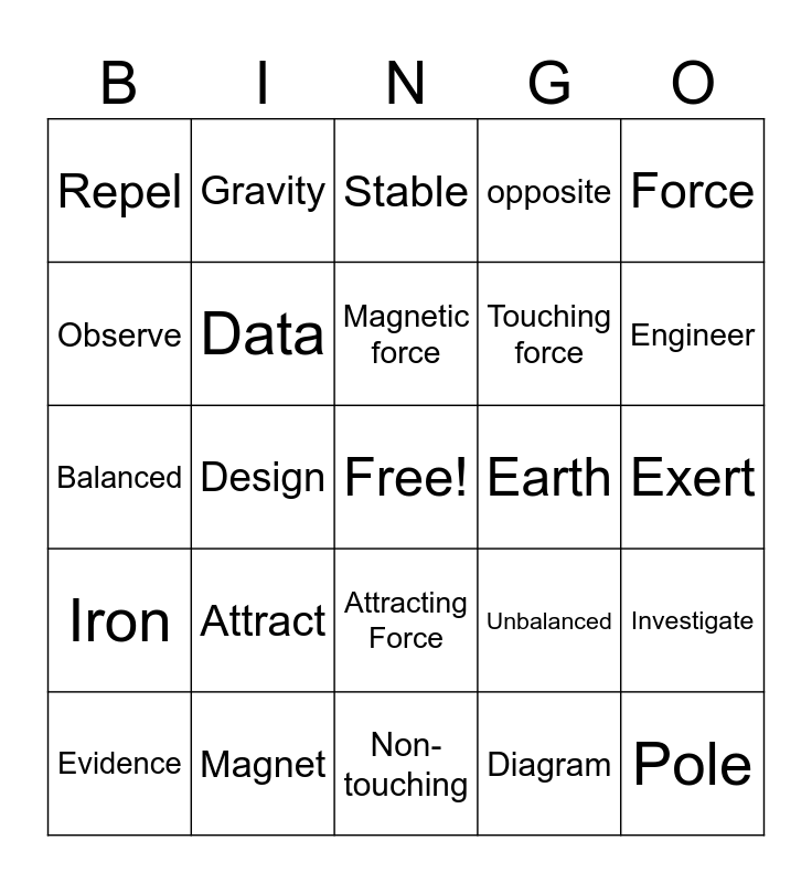 This bingo card has a free space and 24 words: Attract, Magnet, Magnetic force, Evidence, Force, Repel, Observe, Gravity, Earth, Attracting Force, Touching force, Balanced, Unbalanced, Investigate, Data, Diagram, Exert, Stable, Engineer, Design, Pole, Iron, opposite and Non-touching.