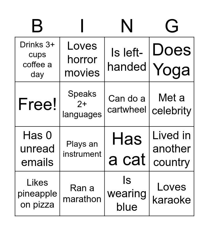This bingo card has 16 words: Ran a marathon, Lived in another country, Is left-handed, Drinks 3+ cups coffee a day, Has 0 unread emails, Loves horror movies, Has a cat, Is wearing blue, Free!, Speaks 2+ languages, Likes pineapple on pizza, Does Yoga, Plays an instrument, Met a celebrity, Can do a cartwheel and Loves karaoke.
