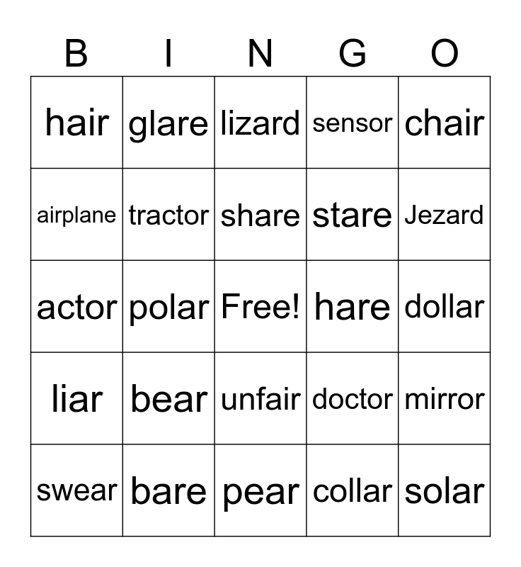 This bingo card has a free space and 24 words: bear, bare, share, swear, chair, hair, airplane, glare, hare, unfair, stare, actor, doctor, mirror, tractor, collar, dollar, lizard, Jezard, polar, solar, liar, sensor and pear.