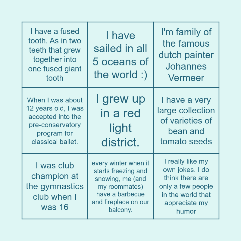 This bingo card has 25 words: I named my first (and only) car I have owned, a campervan named Taro (it means eldest son in Japanese and is also a song from Alt-J about a female war photographer and her love), I’m quite vain when it comes to my hair… so vain indeed that when I applied for my first job in de PMC, I apparently got the nick-name “James Bond”., every winter when it starts freezing and snowing, me (and my roommates) have a barbecue and fireplace on our balcony., I can cross-eye only with one eye, I grew up in a red light district., I have a fused tooth. As in two teeth that grew together into one fused giant tooth, I have a very large collection of varieties of bean and tomato seeds, I have sailed in all 5 oceans of the world :), I light up when I am talking about food and will endlessy mention that I like something when I think it's tasty, I love diving with sharks (or watching video’s of this), I really like my own jokes. I do think there are only a few people in the world that appreciate my humor, I successfully completed my bachelor’s degree in Biomedical Sciences, even though I failed my final exams on biology in high school (twice…), I think with so many women in our groups, we might need less beer, more wine, I was a cheerleader for 1 year, I was club champion at the gymnastics club when I was 16, I was in a circus for 4 years, I write in my agenda when to water my plants otherwise they will all die, I'm family of the famous dutch painter Johannes Vermeer, in winter I only wear mittens because my pinkies are too short, My favorite animal is a penguin., my head was so big at birth that they tested me for hydrocephalus, next to my boyfriend, I love Herman, When i was a kid, i wanted to be in the circus, so i got a unicycle for my birthday and even used it to go to school, When I was about 12 years old, I was accepted into the pre-conservatory program for classical ballet. and when i was younger i wanted to become an actress.