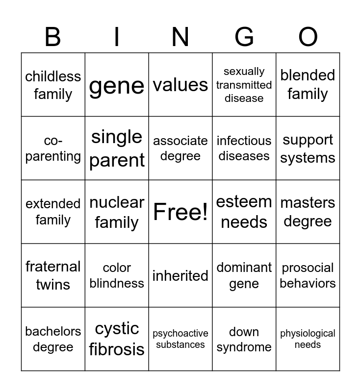 This bingo card has a free space and 24 words: color blindness, cystic fibrosis, associate degree, bachelors degree, blended family, childless family, co-parenting, gene, esteem needs, inherited, infectious diseases, extended family, dominant gene, prosocial behaviors, single parent, down syndrome, masters degree, values, support systems, nuclear family, physiological needs, fraternal twins, sexually transmitted disease and psychoactive substances.