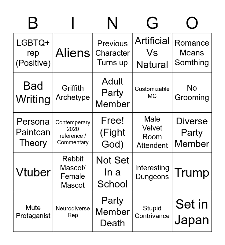 This bingo card has a free space and 29 words: Mute Protaganist, Female Main Character / Split Protags, Contemperary 2020 reference / Commentary, Fat Character (Not Joke), LGBTQ+ rep (Positive), Previous Character Turns up, Griffith Archetype, Rabbit Mascot/ Female Mascot, Male Velvet Room Attendent, Neurodiverse Rep, Diverse Party Member, Set in Japan, Party Member Death, Stupid Contrivance, No Grooming, Bad Endings, Not Set In a School, Vtuber, Romance Means Somthing, Persona Paintcan Theory, Interesting Dungeons, Terrible DLC Practice, Customizable MC, Bad Writing, Artificial Vs Natural, Aliens, Trump, Adult Party Member and Previous Characters Join in final fight.
