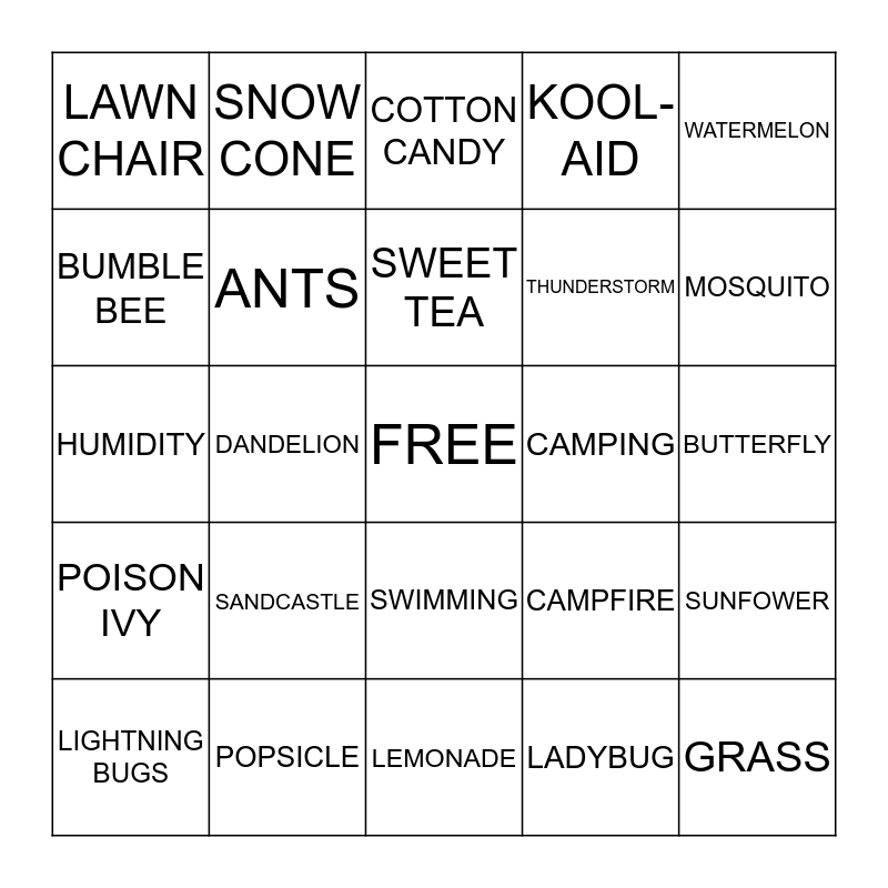 This bingo card has a free space and 24 words: SANDCASTLE, POPSICLE, SWEET TEA, LIGHTNING BUGS, WATERMELON, LAWN CHAIR, BUMBLE BEE, SNOW CONE, CAMPING, SWIMMING, THUNDERSTORM, HUMIDITY, CAMPFIRE, SUNFOWER, ANTS, LADYBUG, BUTTERFLY, COTTON CANDY, MOSQUITO, DANDELION, GRASS, POISON IVY, KOOL-AID and LEMONADE.