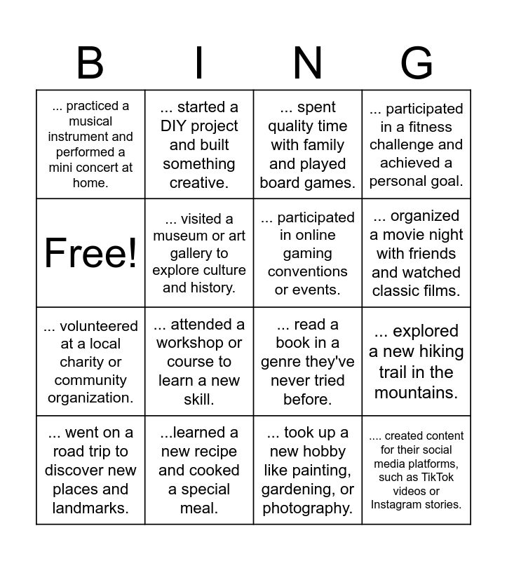 This bingo card has 16 words: ...learned a new recipe and cooked a special meal., ... explored a new hiking trail in the mountains., ... spent quality time with family and played board games., ... practiced a musical instrument and performed a mini concert at home., ... volunteered at a local charity or community organization., ... started a DIY project and built something creative., ... read a book in a genre they've never tried before., ... took up a new hobby like painting, gardening, or photography., Free!, ... visited a museum or art gallery to explore culture and history., ... went on a road trip to discover new places and landmarks., ... participated in a fitness challenge and achieved a personal goal., ... attended a workshop or course to learn a new skill., ... organized a movie night with friends and watched classic films., ... participated in online gaming conventions or events. and .... created content for their social media platforms, such as TikTok videos or Instagram stories..