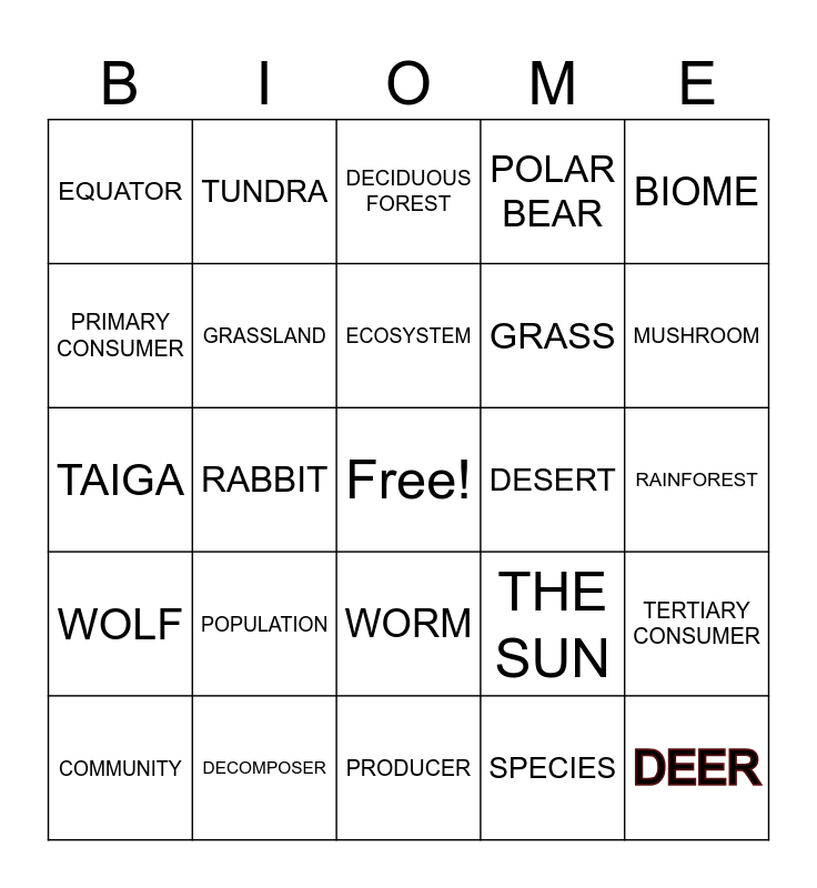 This bingo card has a free space and 24 words: COMMUNITY, POPULATION, ECOSYSTEM, SPECIES, BIOME, EQUATOR, TUNDRA, DECIDUOUS FOREST, DESERT, RAINFOREST, TAIGA, GRASSLAND, THE SUN, TERTIARY CONSUMER, PRIMARY CONSUMER, DECOMPOSER, PRODUCER, POLAR BEAR, MUSHROOM, WOLF, RABBIT, WORM, GRASS and DEER.