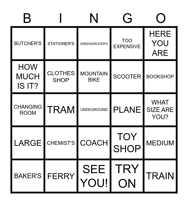 This bingo card has a free space and 24 words: CHEMIST'S, FERRY, MOUNTAIN BIKE, BAKER'S, HERE YOU ARE, BUTCHER'S, HOW MUCH IS IT?, STATIONER'S, PLANE, COACH, SCOOTER, CHANGING ROOM, TOY SHOP, MEDIUM, CLOTHES SHOP, TRY ON, WHAT SIZE ARE YOU?, GREENGROCER'S, BOOKSHOP, TRAM, TRAIN, LARGE, TOO EXPENSIVE and SEE YOU!.