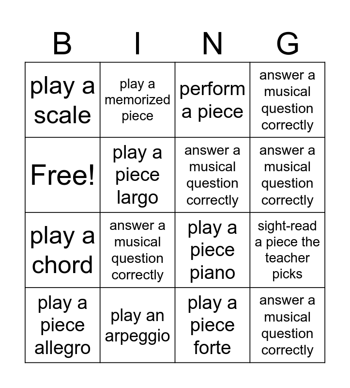 This bingo card has 16 words: play an arpeggio, sight-read a piece the teacher picks, perform a piece, play a scale, play a chord, play a memorized piece, play a piece piano, play a piece forte, Free!, play a piece largo, play a piece allegro, answer a musical question correctly, answer a musical question correctly, answer a musical question correctly, answer a musical question correctly and answer a musical question correctly.
