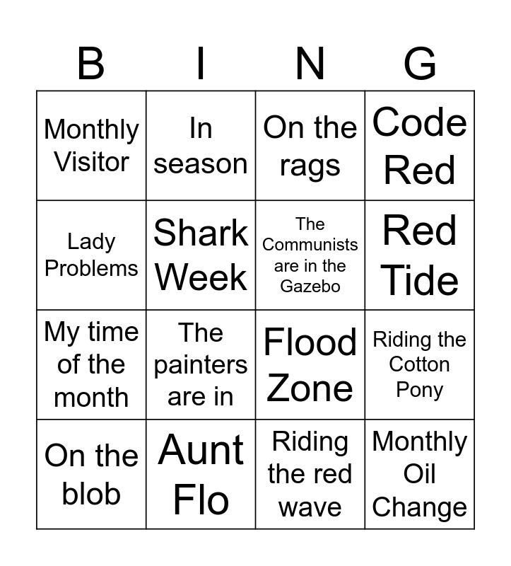 This bingo card has 16 words: Aunt Flo, Riding the Cotton Pony, On the rags, Monthly Visitor, My time of the month, In season, Flood Zone, Riding the red wave, Lady Problems, Shark Week, On the blob, Code Red, The painters are in, Red Tide, The Communists are in the Gazebo and Monthly Oil Change.