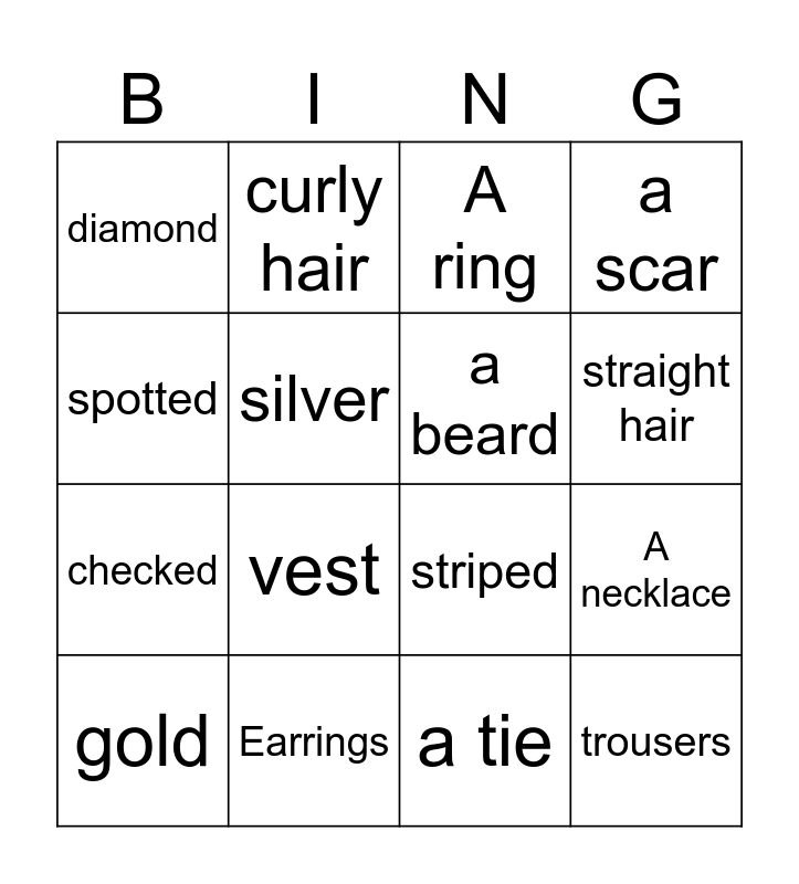 This bingo card has 16 words: Earrings, A necklace, A ring, diamond, checked, curly hair, striped, a tie, spotted, silver, gold, a scar, vest, straight hair, a beard and trousers.
