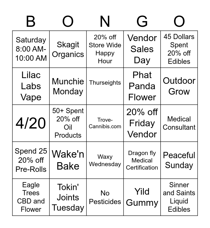 This bingo card has 40 words: Trove, 4/20, Cannabis Christmas, Munchie Monday, Tokin' Joints Tuesday, Waxy Wednesday, Thurseights, Buy 1 get 20% OFF Flower 1/8ths, 45 Dollars Spent 20% off Edibles, Spend 25 20% off Pre-Rolls, 50+ Spent 20% off Oil Products, Vendor Sales Day, Trove-Cannibis.com, Medical Consultant, 20% off Friday Vendor, Wake'n Bake, Night Owl, Saturday 8:00 AM- 10:00 AM, Saturday 10:00 PM- 11:45 PM, 20% off Store Wide Happy Hour, Peaceful Sunday, Yild Gummy, Phat Panda Flower, Lilac Labs Vape, Pacific and Pine Dabs, High Five Farms Flower, Gold Card VIP, 5% off all Products, Sinner and Saints Liquid Edibles, Puffco E-dab rigs, Fox Cannabis, Eagle Trees CBD and Flower, DEM Pure, Dragon fly Medical Certification, Outdoor Grow, No Pesticides, Stone Age Pre-rolls, Closed-Loop System, Skagit Organics and SUBX Flower & Concentrates.