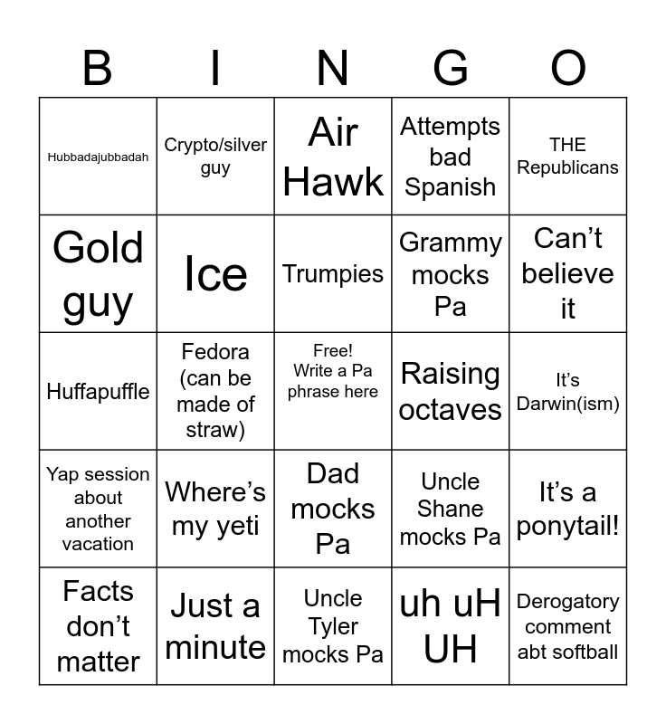 This bingo card has a free space and 24 words: Where’s my yeti, Just a minute, Trumpies, Facts don’t matter, THE Republicans, Hubbadajubbadah, Gold guy, Crypto/silver guy, Raising octaves, Dad mocks Pa, Grammy mocks Pa, Huffapuffle, Uncle Shane mocks Pa, It’s a ponytail!, Ice, uh uH UH, It’s Darwin(ism), Air Hawk, Can’t believe it, Fedora (can be made of straw), Derogatory comment abt softball, Yap session about another vacation, Attempts bad Spanish and Uncle Tyler mocks Pa.