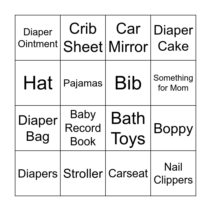 This bingo card has 39 words: Bottle, Swaddle, Pacifier, Bib, Socks, Gift Card, Something for Mom, Onesie, Hat, Nail Clippers, Boppy, Diaper Cake, Diapers, Carseat, Stroller, Bathtub, Baby Lotion, Diaper Ointment, Wipes, Shoes, Pajamas, Baby Monitor, Diaper Bag, Baby Record Book, Stuffed Animal, Something Blue, Something with Baby's Name, Wash cloth, Hooded Towel, Crib Sheet, Bassinet, Pacifier clip, Car Mirror, Teething Toy, Bottle Brush, Burp Cloth, Thermometer, Bath Toys and Diaper Bag.