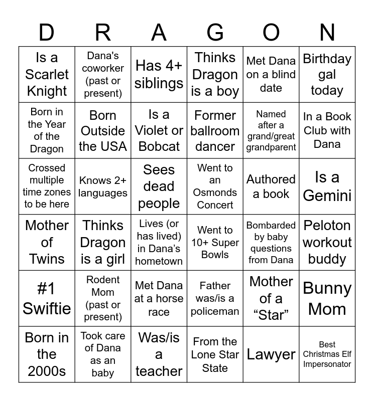 This bingo card has 51 words: Free!, Crossed multiple time zones to be here, Has seen a solar eclipse, Bombarded by baby questions from Dana, Authored a book, Was/is a teacher, Dana's coworker (past or present), Doesn't have an Instagram, Birthday gal today, From the Lone Star State, Born in the Year of the Dragon, Thinks Dragon is a boy, Thinks Dragon is a girl, Mother of Twins, Lives (or has lived) in NYC, Mother of a “Star”, Born Outside the USA, Knows 2+ languages, Is on standby to deliver Dragon, Met Dana on a blind date, In a Book Club with Dana, Peloton workout buddy, Is a Scarlet Knight, Is a Violet or Bobcat, Worked in Public Accounting, #1 Swiftie, Former ballroom dancer, #LGM, Lives (or has lived) in Dana’s hometown, Has 4+ siblings, Has 4+ children, Bunny Mom, Dog Mom, One of the "Harries", Took care of Dana as an baby, Went to 10+ Super Bowls, Met Dana at a horse race, Lawyer, Best Christmas Elf Impersonator, Enjoys Knitting (past or present), Sees dead people, Went to an Osmonds Concert, Beauty pageant participant, Sunshine state resident (past or present), Rodent Mom (past or present), Father was/is a policeman, Named after a grand/great grandparent, Born in the 2000s, Loves to Dance, Is a Gemini and Has a squatty potty.